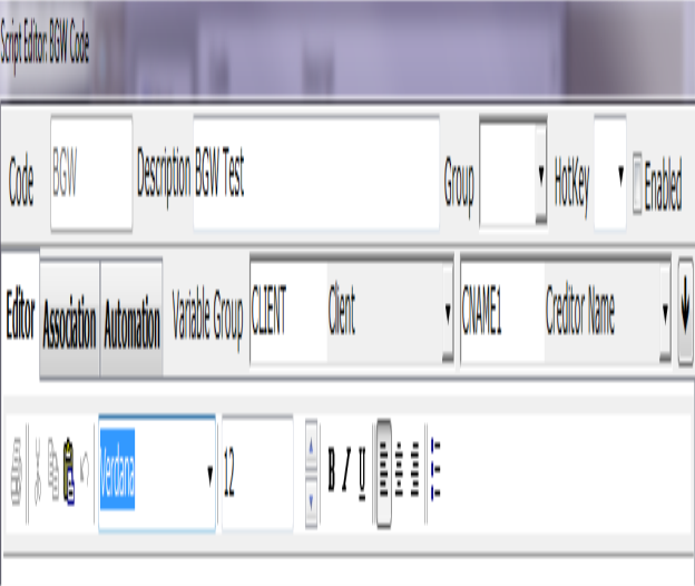 One of the first things you’ll notice in the Editor tab is there are many tools available that are similar in appearance and functionality as most word processing applications. You can also see that there are two drop down menus for adding fields to your scripts. Much like in your documents in CollectMax, the first menu lets you pick what the variable group and the second lets you pick the actual field from the aforementioned group. For example, suppose you would like to add the creditor name to your script. Pick Client from the Variable Group menu, followed by the field CNAME1. After that, click the down arrow on the right.