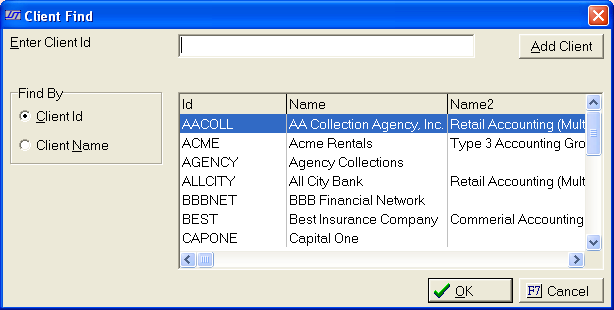 The Client Find window is appear.