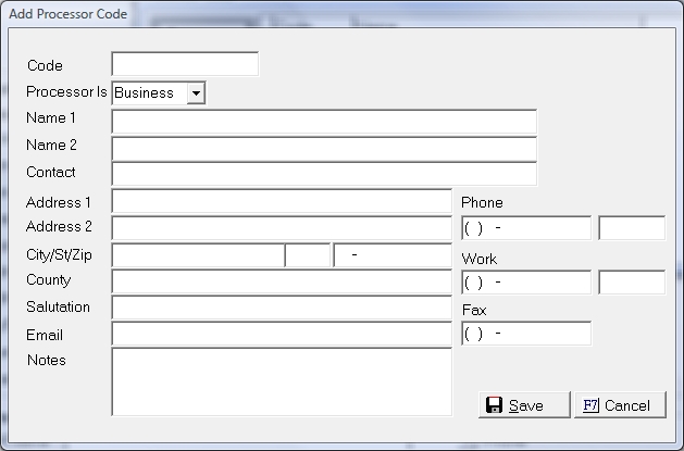 Enter the Code and the Processor Company Information and click the button to add the code to the available code list. Click the