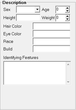 Enter the Sex, Age, Height, Weight, Hair Color, Eye Color, Race, Build and Identifying Features.