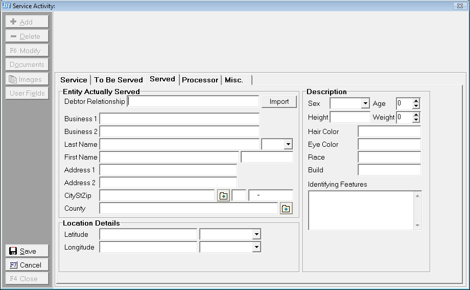 The Served Tab contains information about the person or business actually served by the Process Server.