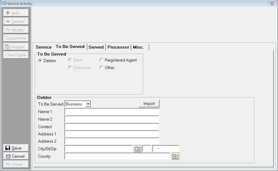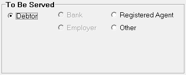 The To Be Served Tab contains the demographics of the debtor or entity to be served.