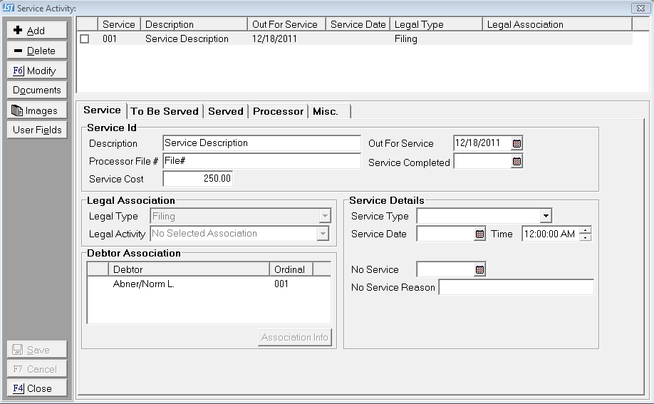 The Service Tab lists detailed information about General Service details, Service Dates and Legal Associations.