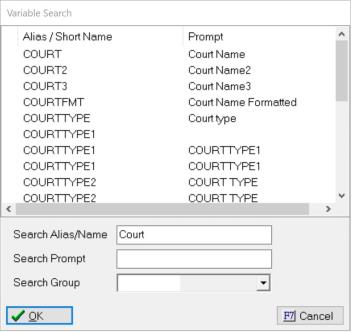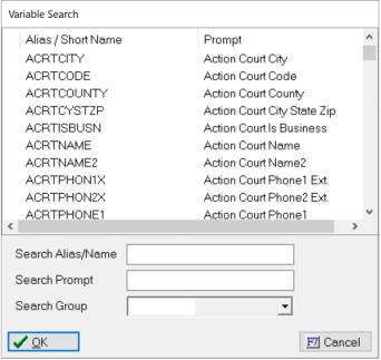 You can choose to search by Variable Code or Short Name or by Variable Prompt. Type what you are looking for and it will search the list of Variables. You can also narrow down the variables to search by picking the variable Groups that correspond to the Groups of Variables in the Master Documents.