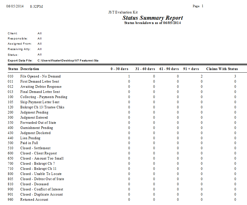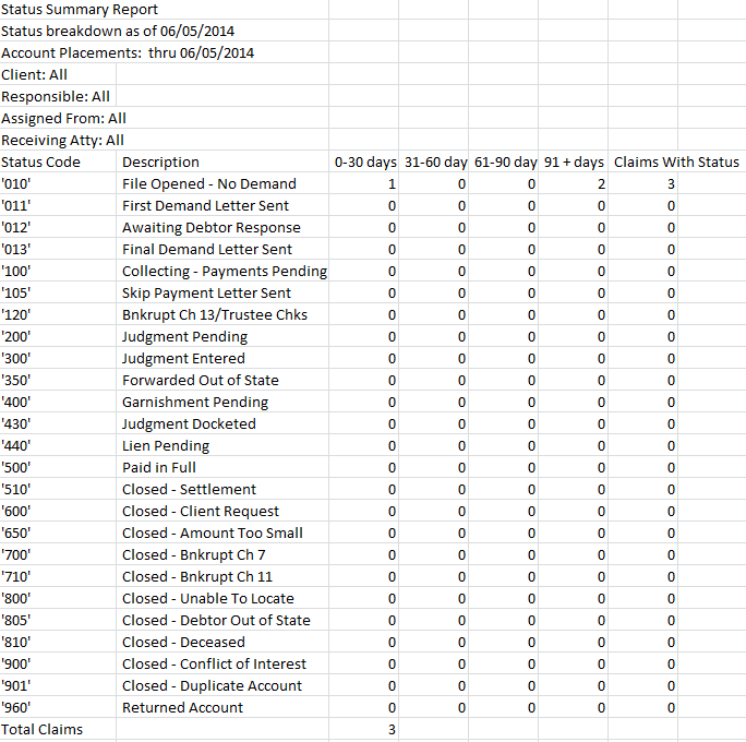 This report lists all the status codes in CollectMax with the number of claims that currently have each status. In V7 we have added a new feature to this report it now will display an aged section for you to determine how long a claim has been in particular status. This feature is beneficial to manage your collection accounts more effectively and protect accounts from slipping thru the cracks.