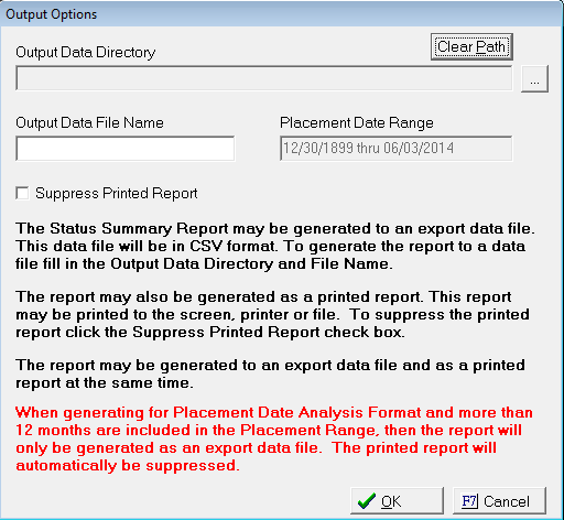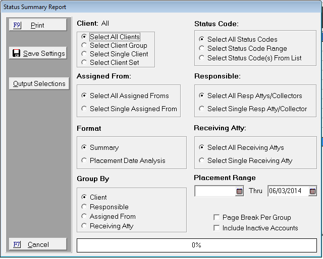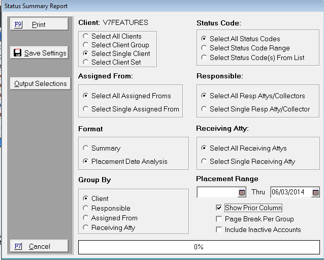 10. Select the appropriate radio button under the “Format” selection criteria. The options are “Summary” and “Placement Date Analysis”. The “Summary” format will produce a report that will list each status code with the number of accounts currently in each status by group. The “Placement Date Analysis” will export a file that will have a column for each placement month with a row for each status listing the number of accounts currently at each status for that placement month for each group.