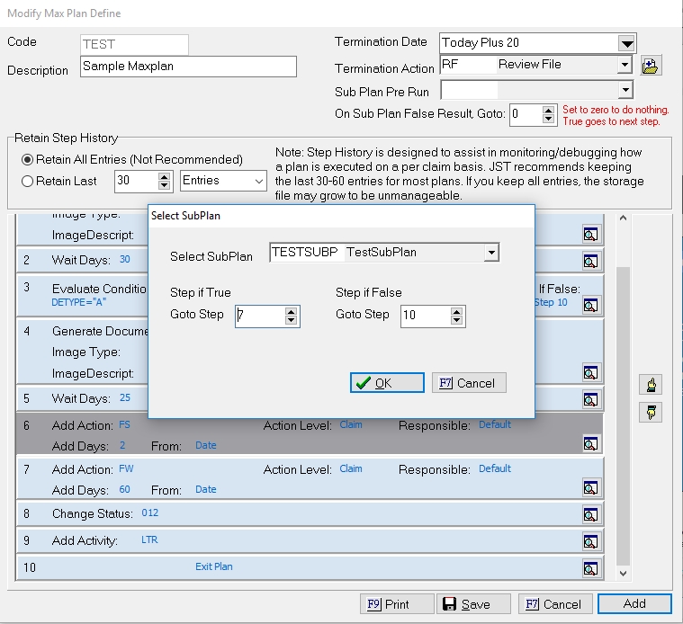 A sub plan can be used for repetitive steps that are processed multiple times within a plan or plans and be inserted into a MaxPlan as one step. It will also allow you to direct an account to another track based on the outcome of the sub plan.