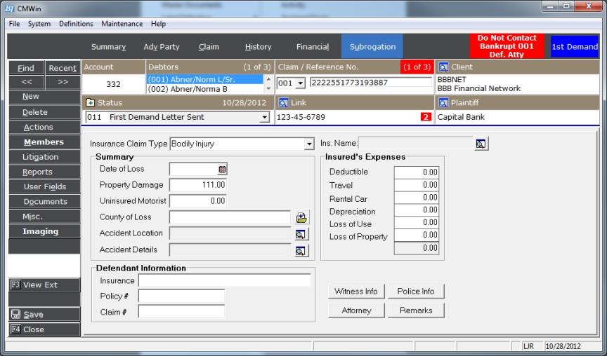 CollectMax offers a Subrogation Module that will allow users to track subrogation insurance accounts. The feature can be turned on at the client level and accounts can be found by the insured party.