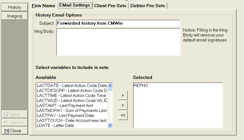 Set the default subject line and/or body text of history and image emails. The system level settings can be overridden at the client level. See Client Level Email Settings.