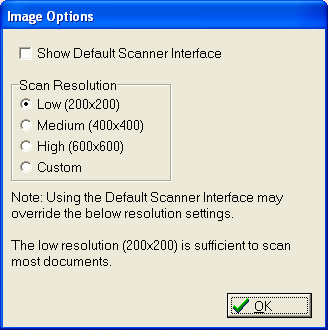 In order to change the Resolution of your scanned images, Click on Options and Scan Resolution. Here you can select a Low Resolution (200x200), Medium Resolution (400x400) or High Resolution (600x600). The system defaults to Low Resolution which is usually sufficient for most documents. Remember the higher the resolution, the larger your image files will be and thus they will take up more hard drive space. If one of the pre-defined resolutions are not satisfactory, you can define your own custom resolution setting by selecting the custom radio button and entering the width and height settings.