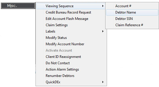 Note: If no viewing sequence is selected, the arrows will take users through the accounts based on how the last debtor was accessed in the debtor account Find form. (For Example: The last debtor was pulled by entering the account number to find the account, the arrows will move in numeric order to the next or preview account number.)