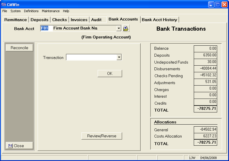 Bank Account Transactions allow you to record such things as bank charges, adjustments and interest earned on the Trust account as well as record bank deposits, disbursements, charges, adjustments and interest earned on the Firm account.