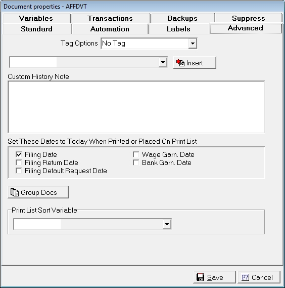The Advanced Tab of the Document Properties allows you to add a custom history notes, update litigation variables, view group documents and add a print list sorting variable for each document printed.