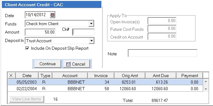 The CAC transaction is used to post client payments and Credit Memos for fees and costs. It is also used to apply client credits to Future Costs Funds.