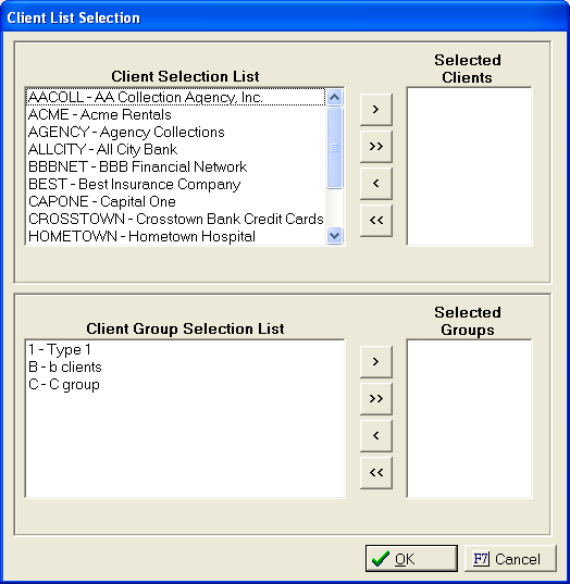The next time this user logs in to CollectMax they will have access to view only accounts assigned to the clients on the Selected List.