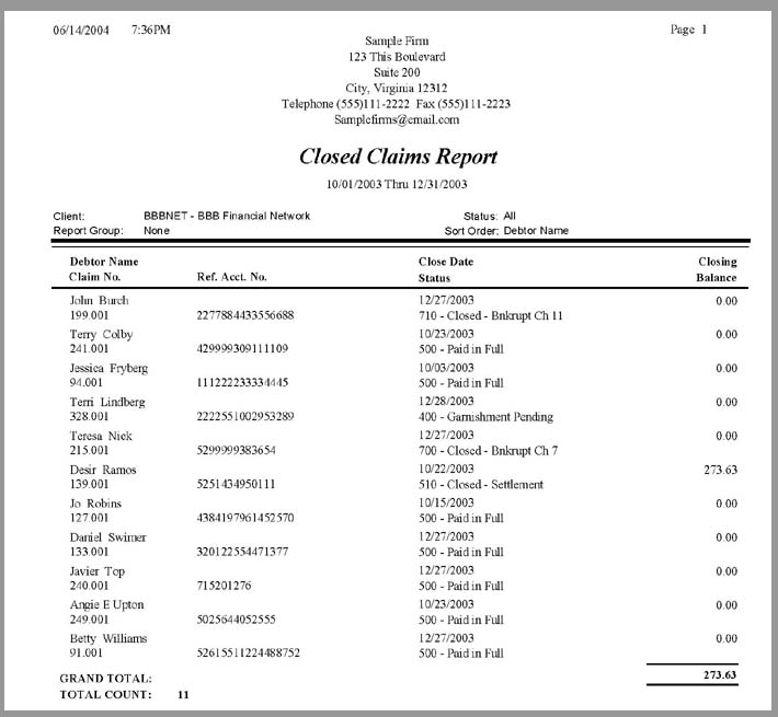 Closed Claims Report Sample