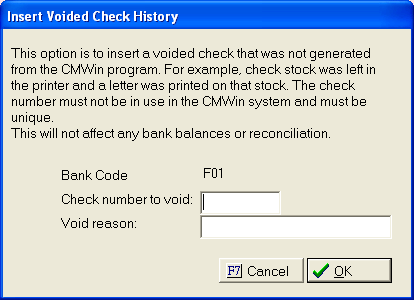 Users may need to use this option if checks were left in the printer and a report or document was mistakenly printed on them. For tracking purposes you may want to put a voided record in the Check History. CollectMax makes allowances to void these checks and enter a history record.