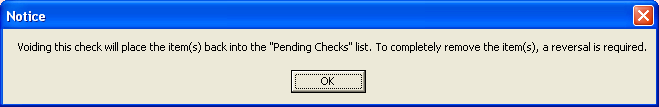 A message box will appear let you know that the check will now be voided and put back to the pending checks screen.