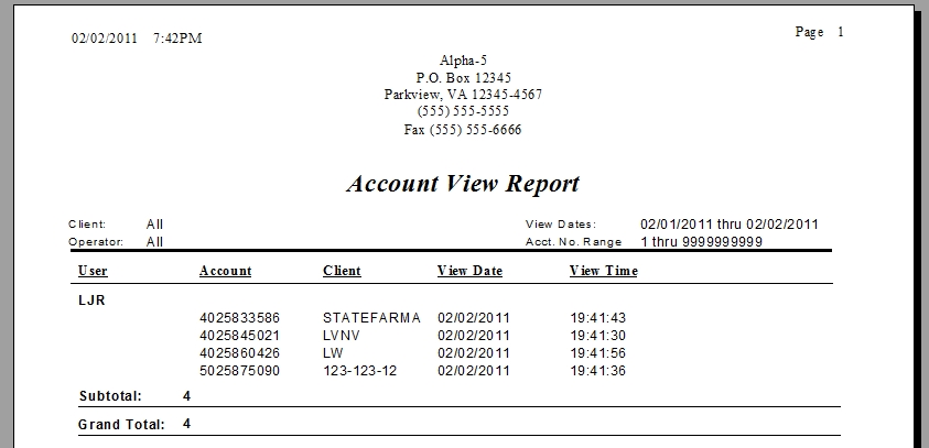 The report is separated by user listing the accounts viewed during the selected time frame, the date and time viewed.
