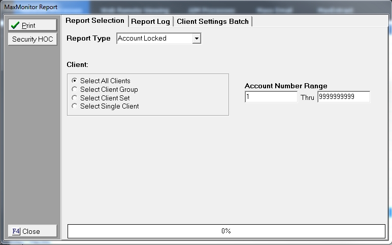 MaxMonitor allows users to Enable Account Access Logging by Batch. User can select All Clients, a Single Client, a Client Group or a Client Set to Enable/Disable MaxMonitor Logging.