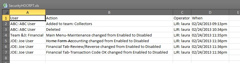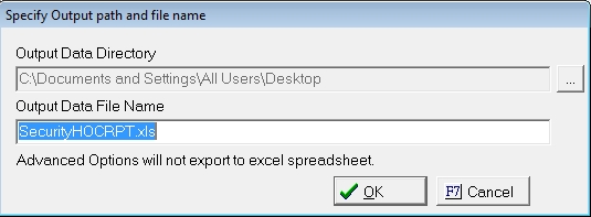 The Excel File will be exported to the desktop with a name of SecurityHOCRPT.xls. You can choose another data export location by clicking the button and browsing to the proper location. You can choose the Report Name by Typing in the name in the Output Data File Name.