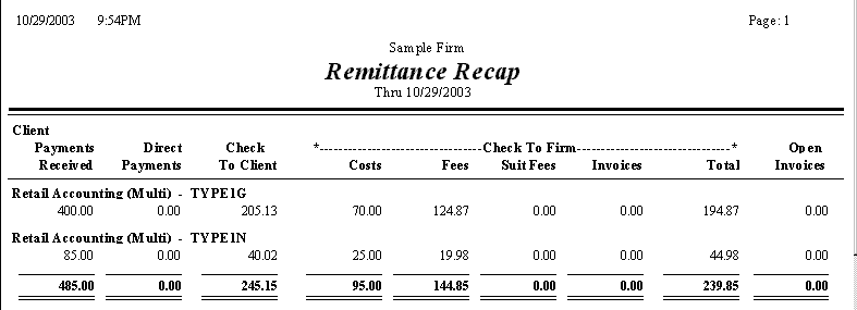 The Remittance Recap Report is a short summary of each Client's Remittance Statement Report. The report has a total of all debtor payments to the firm and all debtor payments made to the client. It also will show the amount of the check to the client, a breakdown of the check to the firm and any open invoices.