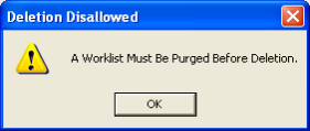 5. If the worklist still has actions assigned, a Deletion Disallowed Screen will appear. Worklists must be purged prior to deleting.