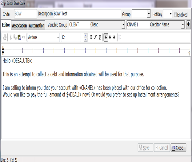 This feature allows you to design predefined scripts with merge variables for your staff to use when communicating with debtors. The script, the date, elapsed time and the operator will be saved for easy access on the account.