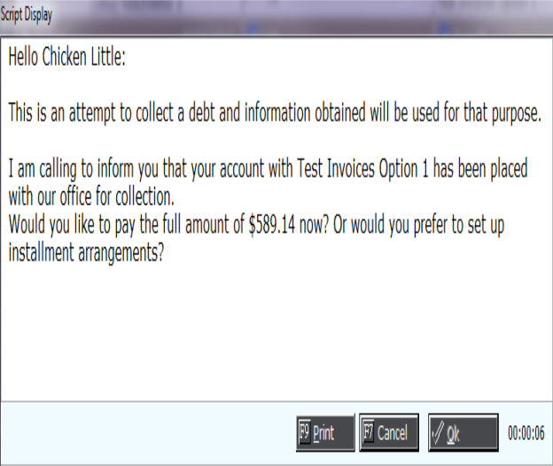 Once the script has been open for 10 seconds, the OK button will become enabled. After you click the OK button, the window will close and there will be a history entry indicating that the script was read to the debtor. You can also choose to print the script from this screen.