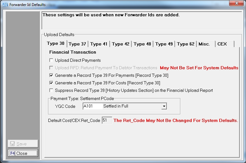 to get to the Forwarder ID Defaults Screen. The first tab will be the Type 30.